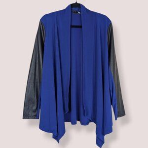 This vintage cardigan by Joan Rivers is made of a rich blue polyester/spandex blend (95/5) with polyurethane faux leather. The cardigan has an open front with long, exaggerated ends, and has black faux leather strips going down the outsides of the arms. The fabric has a nice stretch, and the cut is comfortable to wear.