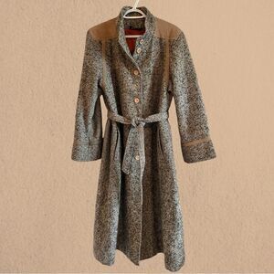 Gorgeous vintage tweed coat with leather accents from Jocardi, made in Canada. Wool, mohair blend with real suede trim and accents. Comes with a waist tie but there are no belt loops! Stunning coat and gorgeous fit, a total classic and the rust coloured interior is a lovely touch. Size 13 but fits more like a medium. Great vintage condition.