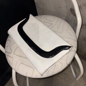 White perforated genuine leather accented with black patent leather, hooks to add strap if desired (strap no included), magnetic button closure, 1 interior pocket with zipper closure.