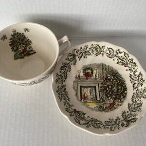 Johnson Brothers " Merry Christmas" ironstone Hand Engraving Made in England Tea Cup and Saucer.. Excellent condition