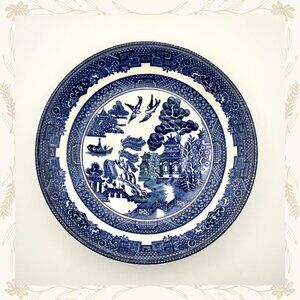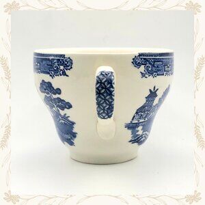 Add timeless charm to your collection with this classic Blue Willow teacup and saucer set by Johnson Brothers, made in England. Featuring the iconic oriental-inspired pattern with pagodas, bridges, and willow trees in rich cobalt blue on crisp white ceramic, this set is a beautiful example of traditional English tableware.