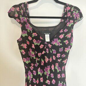 dark cottagecore, dark fairy, whimsigoth, whimsy, Y2K, prom, wedding guest, cocktail party, resortwear, resort wear, sheer dress, sheer midi dress, Jones New York silk dress, black silk floral midi, vintage cocktail dress, Y2K evening dress, whimsygoth silk dress, coquette prom dress, wedding guest silk dress