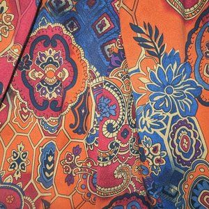 Colour is predominantly orange, blue and pink paisley with a bit of purple and tan/gold