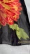 100% silk scarf. Made in Korea, this scarf features a stunning black background with vibrant red and orange floral motifs. The design is accented with delicate gold metallic stripes, adding a subtle shimmer and sophistication.