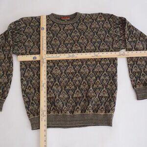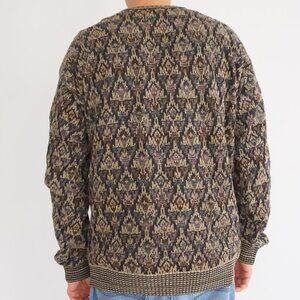 This Vintage Jos. A. Bank sweater brings a rich, Eclectic Grandpa charm with its warm brown palette and intricately woven multi-tone pattern that looks straight out of a curated vintage wardrobe. The textured knit has an earthy Old Money feel, blending muted tans, touches of deep green, subtle burgundy, and soft charcoal tones that create a tapestry-like effect. It’s the kind of sweater that instantly elevates a simple outfit, giving off a quietly confident, heritage-inspired vibe without feeling too formal.