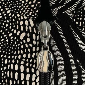 Black and cream Joseph Ribkoff vintage bomber style zip-up jacket featuring a bold abstract animal patchwork print. Soft, stretch jersey knit fabric with a small collar and decorative enamel zipper pull. A chic and rare collector piece — easy to dress up for the office, art event, or evening out.