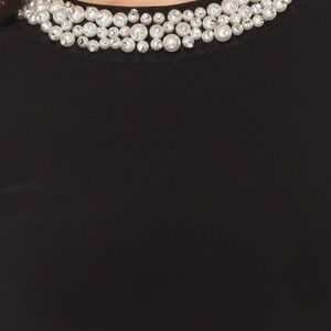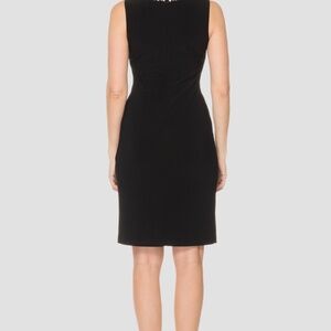 Featuring sleeveless construction as well as pearl accents along the rounded neckline, this Joseph Ribkoff design sheath dress includes knee-length hem and fitted cut through the natural waist.