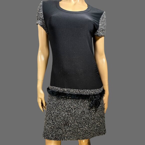 Vintage Joseph Ribkoff Drop Waist Short Dress Size 6 Black Gray Knit Beaded Bow