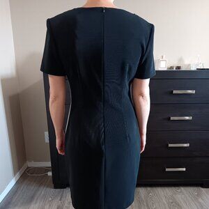 This is a unique vintage white and black dress by Joseph Ribkoff. Made in Canada, union made ILGWU, 92% polyester and 8% spandex. It features small shoulder pads and a zipper in the back. It is a vintage size 10. Please see measurements below. Please note than I am 4'11/5" and am modelling the dress. If you are taller than me, the dress will be shorter on you. There are two small pulls in the fabric on the bottom black portion of the front of the dress and two on the back of the dress. I only noticed them just now and they are hard to see unless you are looking for them.