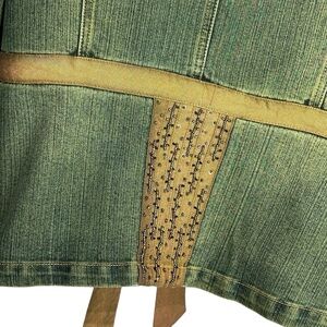 Vintage Joy London Denim Ruffled Beaded Jean Jacket is in very good preloved condition. Please keep in mind it is a vintage piece. I have done my best to capture its condition in pics. The tie that ties at front does have some wee holes here and there. This does not affect look or wear of this fabulous piece. Please see all pics! The brown ruffles with beaded accents throughout just make this jacket. The turquoise metal buttons with their intricate detail are in great shape with no chipping. Sleeves are a bit wider to allow something to be worn heavier underneath. 80% cotton, 15% nylon, 5% spandex. Hand wash and hang to dry. Tag states a size 12. I feel by the measurements I have provided that it would fit like a large / extra large. Make a statement wearing this unique jean jacket. You will definitely stand out wearing it.