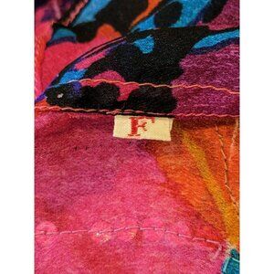 PLEASE NOTE: Good vintage condition. May have some loose or missing threading and/or sequins throughout but is hard to see because of print. Loop strip from hook and loop attachment left on shoulders, likely from removal of shoulder pads. No size tag except for a small label on inside with a letter F (free size?). Will fit up to a 3X, but please compare measurements provided with your own to ensure fit.