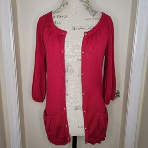 Fucshia Pink Knit Button Front Wide Neck Cardigan Sweater with Front Patch Pockets and Bow Detail in Back, by Juicy Couture.