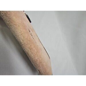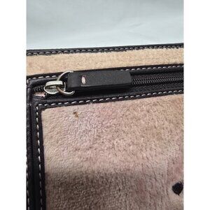 The outside of the wallet has some discoloration and stains. There is a stain on the back and lots of yellowing like discoloration around the outside. The zipper has some tarnishing to the color as well. See photos for the condition and noted flaws.