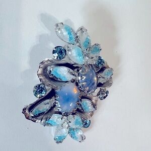 Really gorgeous, dreamy but sophisticated brooch with turquoise stones either glass or crystal. A resin leaf moonstone looking middle stones. The piece appears to be silver, although I cannot find an actual stamp.