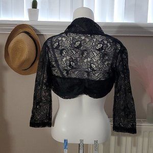 Cropped, lace, deep black, long sleeved.