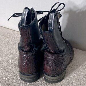 Great vintage condition. Minor signs of wear shown in pics. Please look at pics carefully, unique burgundy black pebbled leather. Packer style. Size 7, measurements in pics.