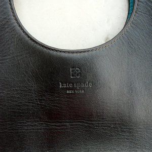Unique Kate Spade handbag with a cut-out handle. Black leather exterior, turquoise interior, made in Italy. 2 zip pockets inside, with additional pockets along one side. Exterior looks great; the interior has some staining.
