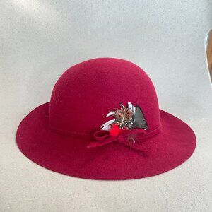 Round crown brim hat with felt ribbon and bow + embellished with feathers.