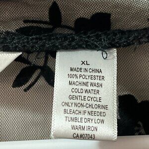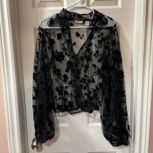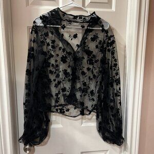 Vintage Kaktus Black Floral Sheer Blouse Mini Front Button Up Bell Sleeve Witchy