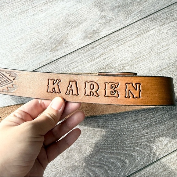This vintage Karen Brown leather belt strap features intricate hand-tooled eagle designs, showcasing expert craftsmanship and classic Western style. Durable and unique, it's perfect for adding a bold statement to any outfit.