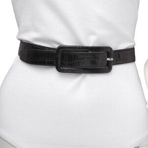 Vintage Karen Palmer Leather Croc Embossed Belt Long Buckle Black Classic Retro