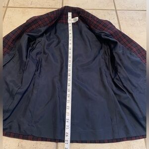 This is a stylish vintage blazer by the Canadian brand Karolyne Petite. This jacket features a classic red and navy blue plaid pattern, a notch lapel, and elegant gold-toned buttons. The tailored "petite" fit is perfect for those with a smaller frame. It's a versatile piece that can be dressed up for the office or worn casually with jeans for a chic, preppy look.