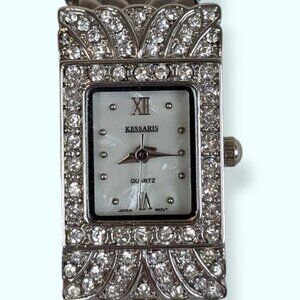 This vintage set by Kessaris includes a watch and bracelet with a matching faux pearl motif. The pieces have their own black case (which has a slightly misaligned hinge) and still have their original info printouts. The watch has a hinge above and below the face, which is covered in small white rhinestones. I'm not sure if these are glass or cz, but more likely glass. The watch has a stainless steel case and Japan movement (model JC114), as well as a beautiful pearlescent face. The band has the same 4 rows of beige faux pearls as the bracelet has all the way around. The bracelet has a single hinge on one side and "clicks" into place on the other, though it is slightly misaligned and needs a little help to find the click.
