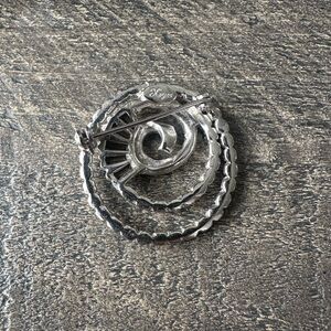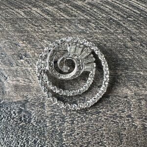 Circa 1960. Silver toned with clear rhinestone spiral brooch. Signed Keyes
