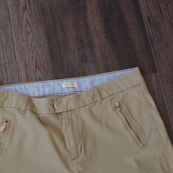 Women's U.S Polo pants ,98% cotton,2% spandex ,Khaki color.Zipper pockets with cute tag with polo brand.straight leg,size ten.inseam is 27 inches long.waist 34.and stretcg to them.