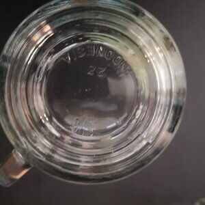 Clear glass mugs with Christmas scenes on them.