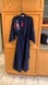 Gorgeous navy blue, with red thin piping along opening. Can tie it on the inside and comes with matching belt.