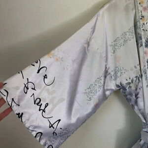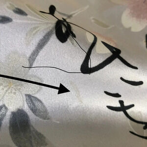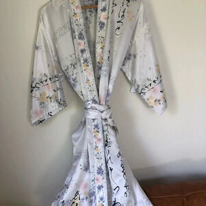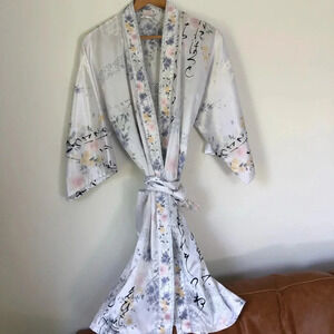 Made in Japan robe/kimono style - silky look/feel - polyester - 2 front pockets - no size tag - see approximate measurements below. There are two tiny hardly noticeable stains on right front (see photos) but overall this vintage piece is in great condition