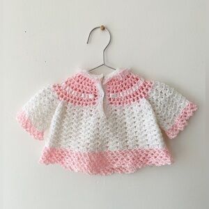 Vintage - Knit Baby Sweater - Lace & Rosette Details - Pink & White - Size 0-3m