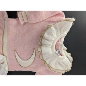 Everything about it so dreamy. The pastel pink wool is so light and fluffy, the little moon is just everything! IT has cute white and gold stripes on waist and cuffs and the double layered neck ruffle!! Tag says Made in France - Clayeux T-2. There is no fiber tag however.
