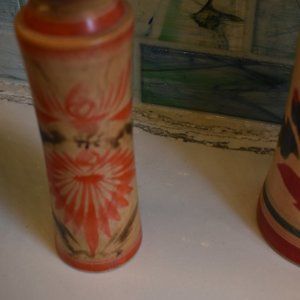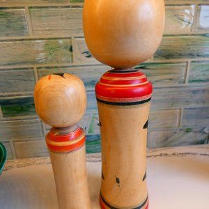 Excellent Vintage item pre-owned condition - From Japan and Originally from the northeastern region (Tōhoku-chihō) of Japan, they are handmade from wood, having a simple trunk and head with a few thin, painted lines to define the face. The body often has floral and/or ring designs painted in red, black, and sometimes green, purple, blue, or yellow inks, and covered with a layer of wax. One characteristic of kokeshi dolls is their lack of arms or legs. Since the 1950s, kokeshi makers have signed their work, usually on the bottom and sometimes on the back. - Large is 12" and small is 8" - Handmade and signed on bottom- overal in good vintage condition with minor wear.