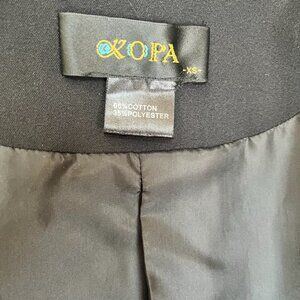 A classic black silhouette blazer with striped cuff hems and a single button. In impeccable used condition.