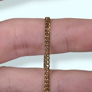 This vintage tie clip with chain by Krementz USA is made of a gold tone metal and is stamped "Krementz USA" on the back of the clip. Based on the lack of patina or tone change (and the brand), it's likely that this piece is gold plated but there are no markings. The front of the bar is smooth and shiny with a small ding on the opposite side of the loop (see pic 4). There is a chain dangling from one end to the other that is in good condition. The piece has normal wear throughout, but is still very wearable.