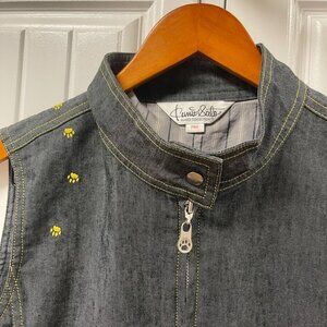 Rare Japanese streetwear piece from the Kunio Collection, designed by artist Kunio Sato. Made in Japan, this high-quality denim vest features yellow embroidered paw prints, a stand collar with snap closure, large utility pockets, and signature paw-shaped zipper pull. Unique design details make this a true collector’s item for fans of Japanese vintage fashion.