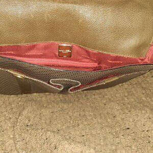 1 full width back outer pocket, 2 magnetic snaps under square leather pieces (1 with Lancel logo) on front. Under these are 2 long pockets. Inside has 1 zip, 1 phone and 1 large area. All lined with signature 1876 red satin Lancel fabric.