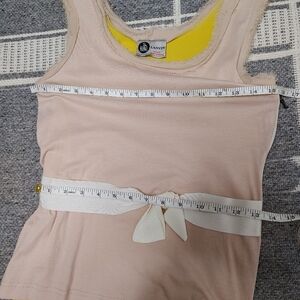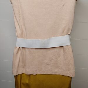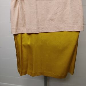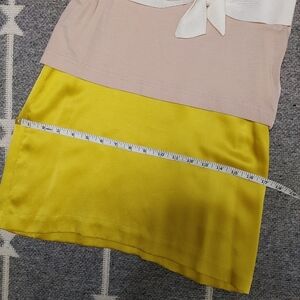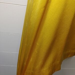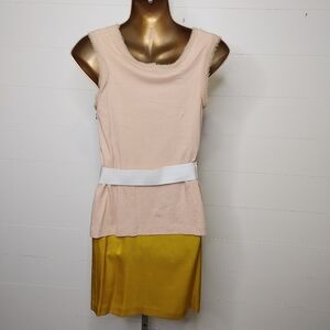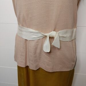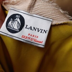 Stunning silk vintage early 2000's sleeveless dress by Lanvin. pull over styling. Attached bow belt. No care tags. The skirt is definitely silk. Unsure of the top. Top does have stretch. The yellow/gold silk does have some imperfections (see photos). I think these are scratches in the fabric. They're not very noticeable and you only get a glimpse of them in certain lighting/certain angles. Seam has very minor imperfections that do not affect the garment. One tiny unnoticeable faint yellow stain on belt. difficult to capture on camera. In otherwise excellent condition.
