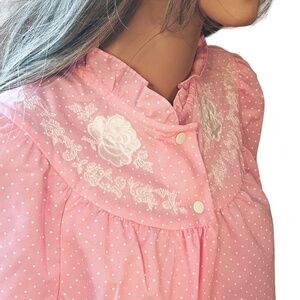 Features: Full snap front, gathered yoke back, gathered front yoke, sits below the knee, satin floral applique and embroidery on front yoke, ruffled neckline and sleeve openings, roomy pocket on right hip, non-stretch fabric