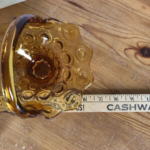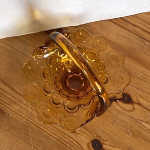 Amber glass bowl with footed base and blown glass handle. Excellent condition, no chips or cracks.