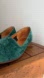 Beautiful crushed velvet slip-on flats! I'm having a bit of a velvet moment, so when I saw these, I was immediately smitten. Lush blue-green crushed velvet exteriors with leather soles and a flat heel. The colour is really magical! Made in Canada. The size is somehow not marked on these, but they fit like a US 9. Please see the measurements, and compare to a shoe that fits you well, for best fit.