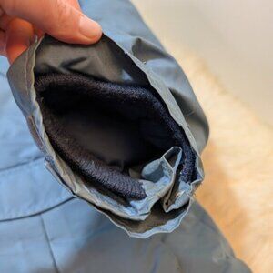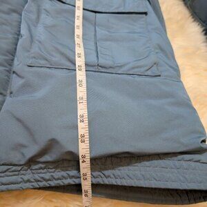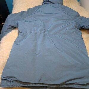 This parka is in very good condition. It is quilted on the inside with nylon on the outer shell to keep the wind out. It is very long and puffy. There is some staining around the sleeve cuffs.