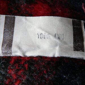 Thick woven wool including various shades of red, navy blue, grey, and black. Features patch pockets in the front on both sides, cuffs at sleeves sewn flat, a belt, and fancy belt loops. There are no obvious signs of wear.
