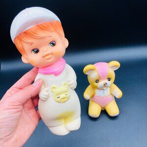 Vintage LOT of 60s Kitsch Squeaky Toys Little Boy -Teddy Bear with Baby Blanket
