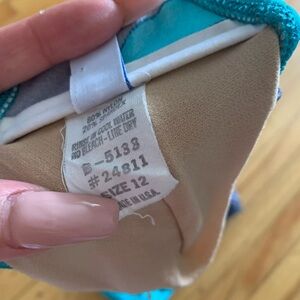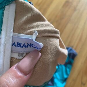 Stylish bikini set. Features a twist bandeau top and matching bottoms. Says size 12 but more of a small