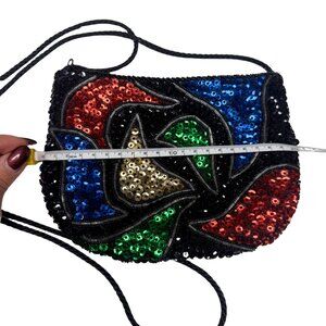 Stunning vintage La Regale bag, handmade in Macau, featuring multicolored sequins and beads. The bag has a braided strap and showcases exquisite craftsmanship, making it perfect for evening events or collectors of vintage accessories.