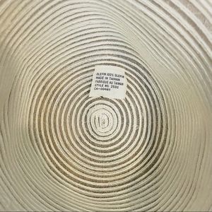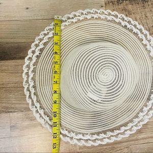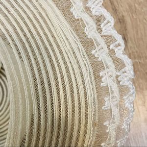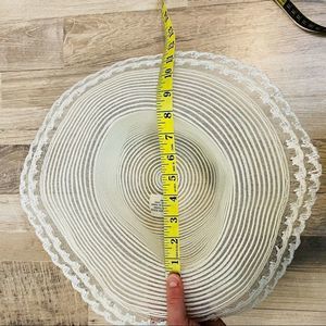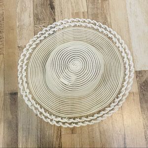 This gorgeous vintage hat has me thinking of spring! Adorned with lace and constructed out of sewn layers of olefin for a ribbed effect, this hat is in excellent gently used condition (9/10) with some slight subtle discolouring inside the hat, but this is not at all noticeable when worn.