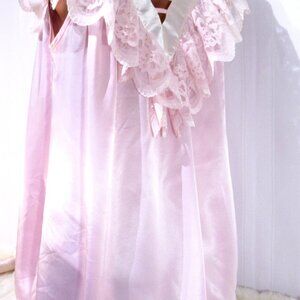 There are no tags on this nightgown, but I'll just say that it is exquisitely feminine -- mainly because of the heavier satiny soft nylon it's sewn from. Gorgeous layers of ruffles and lace at the front, hem, and side slit, and I love the layered lace at the shoulders. It measures up to 20 inches underarm to underarm, so I think it's probably good for a medium or slightly larger fit, perhaps best for someone with up to a 38 inch chest. Length is 34 inches from top of shoulder to hem. This nightgown is in excellent vintage condition. No tags present.